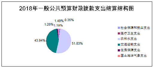 2018年一般公共预算财政拨款支出14858.36万元,主要用于以下方面:社会保障和就业支出221.22万元,占1.49%;医疗卫生支出52.14万元,占0.35%;农林水支出7702.08万元,占51.83%;交通运输支出6528.66万元,占43.94%;国土海洋气象支出177.91万元,占1.20%;住房保障支出176.35万元,占1.19%。