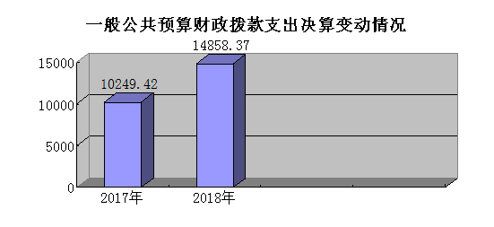 2018年度一般公共预算财政拨款支出14858.36万元,占本年支出合计的43.27%。与2017年10249.42万元相比,一般公共预算财政拨款上升4608.94万元,上升44.97%,主要原因是2018年统筹整合财政涉农资金用于道路建设工程款按县上安排由主管部门负责支付。