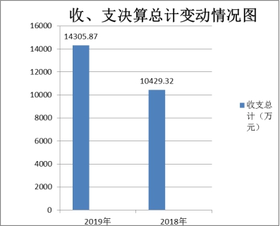 2019年度收、支总计14305.87万元。与2018年度收、支总计10429.32万元相比,收、支总计各增加3876.55万元,增长37.17%。主要变动原因是项目资金增多。