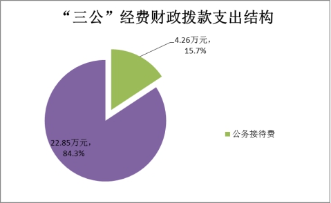2019年“三公”经费财政拨款支出决算中,因公出国(境)费支出决算0万元,占0%;公务用车购置及运行维护费支出决算22.85万元,占84.3%;公务接待费支出决算4.26万元,占15.7%。具体情况如下:
