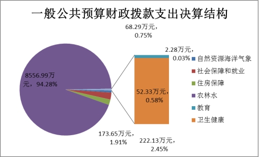 2019年一般公共预算财政拨款支出9,075.67万元,主要用于以下方面:教育支出(类)2.28万元,占0.03%;社会保障和就业(类)支出222.13万元,占2.45%;卫生健康支出52.33万元,占0.58%;农林水支出8556.99万元,占94.28%;自然资源海洋气象等支出68.29万元,占0.75%;住房保障支出173.65万元,占1.91%。