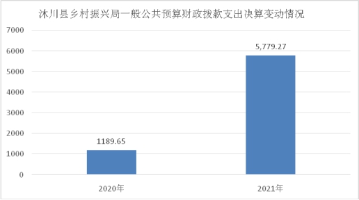 2021年一般公共预算财政拨款支出5779.27万元,占本年支出合计的92.46%。与2020年相比,一般公共预算财政拨款支出增加4589.62万元,增长385.79%,主要变动原因是统筹整合使用财政涉农资金支出增加所致。