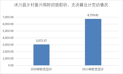 2021年度收、支总计6759.81万元,与2020年相比,财政拨款收、支总计各增加3687.44万元,增长120.02%。主要变动原因是2021年下达的统筹整合使用财政涉农资金增多,并加快了统筹整合使用财政涉农资金报账进度所致。