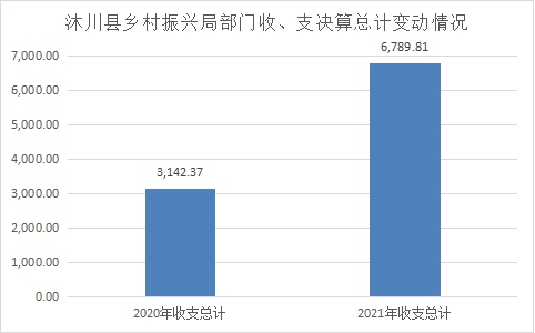 2021年度收、支总计6789.81万元,与2020年相比,收、支总计各增加3647.44万元,增长116.07%。主要变动原因是2021年下达的统筹整合使用财政涉农资金增多,并加快了统筹整合使用财政涉农资金报账进度所致。