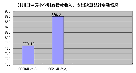 2021年度收、支总计880.20万元。与2020年相比,收、支总计各增加110.08万元,增长14.29%。主要变动原因是2020年9月将原沐溪学校拆分为沐溪小学和沐溪初级中学,经费只核算4个月造成变动幅度较大。