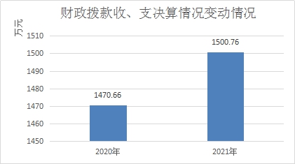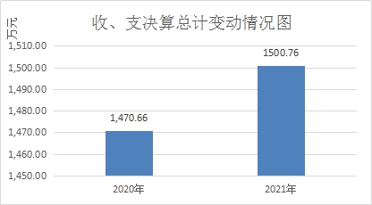 2021年度收、支总计1500.76万元。与2020年相比,收、支总计各增加30.10万元,增长2.05%。主要变动原因是年初结转和结余43.14万元。