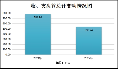 2022年度收、支总计538.74万元。与2021年相比,收、支总计各减少246.22万元,下降31.4%。主要变动原因是人员减少以及年末结转结余减少为零,收支总计减少。
