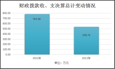 2022年财政拨款收、支总计538.74万元。与2021年相比,财政拨款收、支总计各减少246.22万元,下降31.4%。主要变动原因是人员减少以及年末结转结余减少为零,收支总计减少。