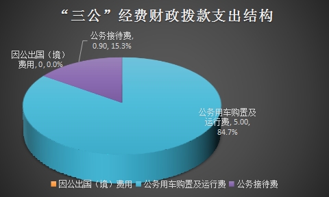 2022年“三公”经费财政拨款支出决算中,因公出国(境)费支出决算0万元,占0%;公务用车购置及运行维护费支出决算5.00万元,占84.7%;公务接待费支出决算0.90万元,占15.3%。具体情况如下: