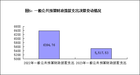 2023年度一般公共预算财政拨款支出5517.53万元,占本年支出合计的50.45%。与2022年度相比,一般公共预算财政拨款支出减少877.23万元,下降13.72%。主要变动原因是2023年大部门分项目预算为政府性基金预算,使得一般公共预算财政拨款支出减少。