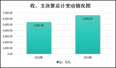 2023年度收、支总计均为6593.97万元。与2022年度相比,收、支总计各增加1141.31万元,增长20.93%。主要变动原因是基础设施项目及采购项目增加。