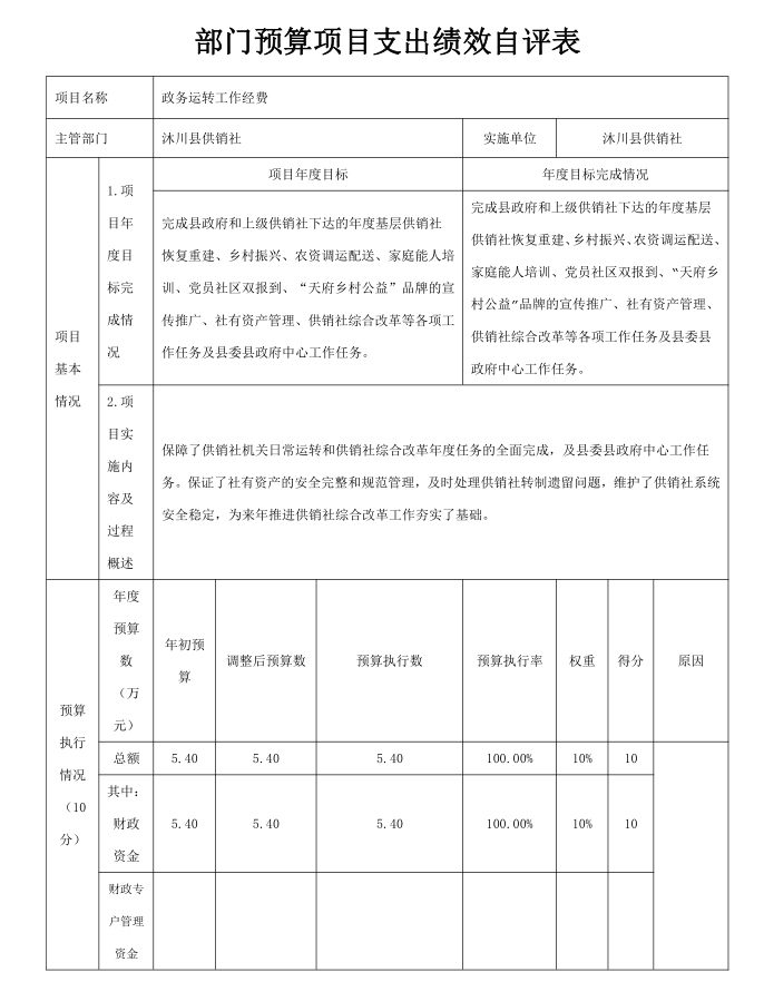 自评得分24分。2024年度,沐川县供销社年初预算编制科学合理,全年预算执行进度较好,未发现违规支出金额,全年部门整体结余率0。严格落实党政机关过紧日子要求,严控“三公”经费、会议、培训、差旅费等一般性支出。