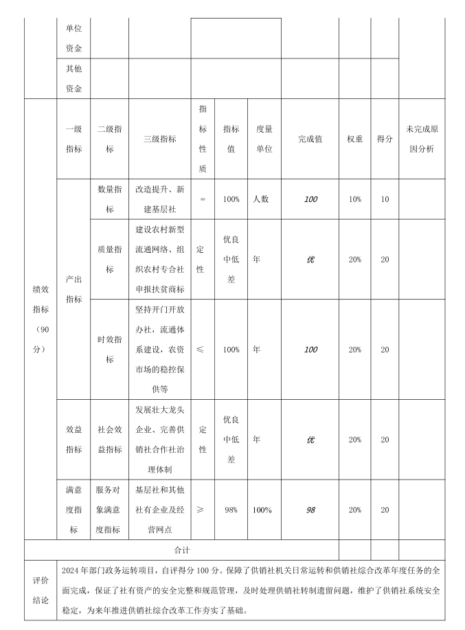 (一)评价结论。2024年度,沐川县供销社部门整体支出绩效目标与法律法规、部门职责、中长期规划相符,目标任务合理可行。预算测算依据充分,支出预决算偏差度较小,绩效监控管理较严格。执收非税收入符合相关规定并上缴及时,资产管理规范,内控制度健全并执行有效,相关信息公开及时。任务指标完成情况较好,协作部门、管理对象和社会公众基本满意。2024年度部门整体支出绩效良好,自评总得分98.8分。