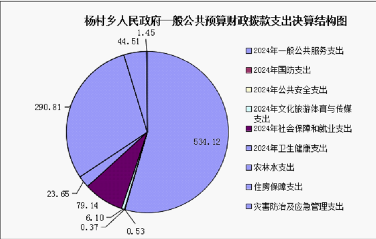 2024年度一般公共预算财政拨款支出980.68万元,主要用于以下方面:一般公共服务支出534.12万元,占54.46%;国防支出0.53万元,占0.06%;公共安全支出0.37万元,占0.04%;文化旅游体育与传媒支出6.1万元,占0.62%;社会保障和就业支出79.14万元,占8.07%;卫生健康支出23.65万元,占2.41%;农林水支出290.81万元,占29.65%;住房保障支出44.51万元,占4.54%;灾害防治及应急管理支出1.45万元,占0.15%。