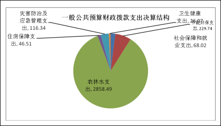 2024年度一般公共预算财政拨款支出3,345.17万元,主要用于以下方面: 社会保障和就业支出68.02万元,占2%;卫生健康支出26.07万元,占0.8%;节能环保支出229.74万元,占6.9%;农林水支出2858.49万元,占85.4%;住房保障支出46.51万元,占1.4%;灾害防治及应急管理支出116.34万元,占3.5%。