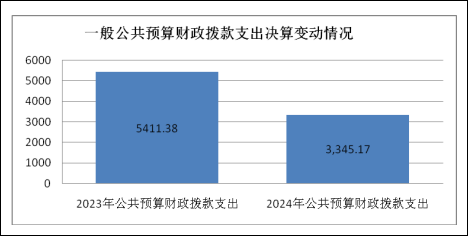 2024年度一般公共预算财政拨款支出3,345.17万元,占本年支出合计的94.6%。与2023年度相比,一般公共预算财政拨款支出减少2066.21万元,下降38.2%。主要变动原因是2024年森林生态效益项目支出减少