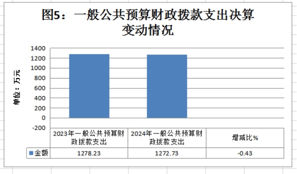 2024年一般公共预算财政拨款支出1272.73万元,占本年支出合计(是占一般公共预算+基金预算+国有资本预算合计的比重)的98.97%。与2023年相比,一般公共预算财政拨款减少5.5万元,下降0.43%。主要变动原因是节能环保支出的补助减少。(如图5)