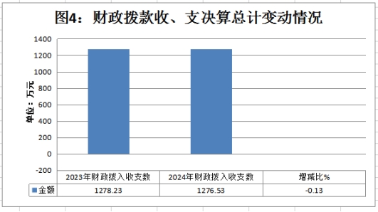 2024年财政拨款收、支总计1276.53万元。与2023年相比,财政拨款收、支总计各减少1.7万元,下降0.13%。主要变动原因是节能环保支出的补助减少。(如图4)