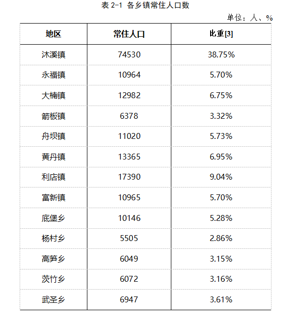13个乡镇中,常住人口[2]超过5万人的乡镇有1个,其余乡镇的常住人口都在2万人以下,其中常住人口在1万人至2万人之间的乡镇有7个;在0.6万人至1万人之间的乡镇有4个;少于0.6万人的乡镇有1个。常住人口居前三位的乡镇是沐溪镇、利店镇、黄丹镇,合计占全县常住人口比重为54.75%。