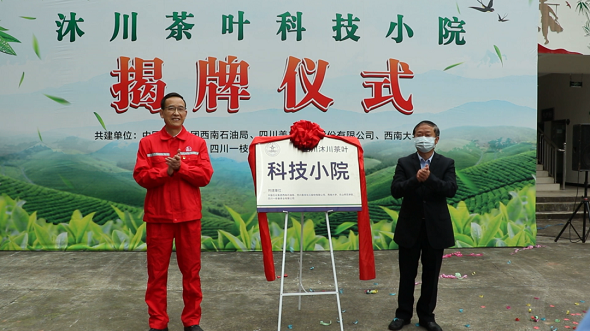 中石化西南油气分公司党委副书记曾德超,县人大常委会主任胥大齐共同为“四川沐川茶叶科技小院”揭牌。
