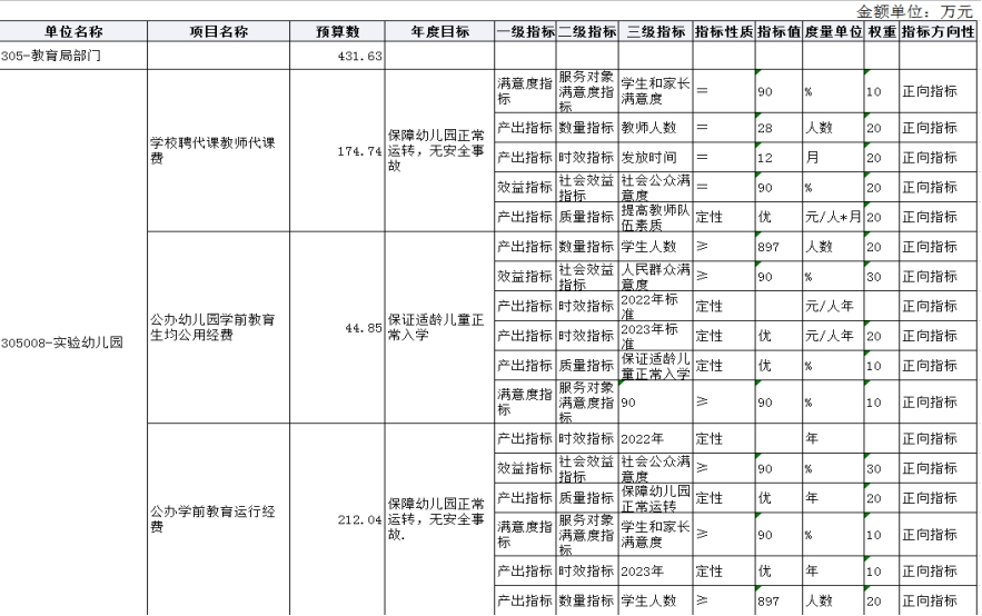 (四)绩效目标设置情况。2023年,沐川县实验幼儿园按要求实行绩效目标管理,编制了项目绩效目标的预算431.63万元,主要为51112922T000004718619-学校聘代课教师代课费项目、51112922T000004719128-公办幼儿园学前教育生均公用经费、51112922T000004724008-公办学前教育运行经费项目。如下图: